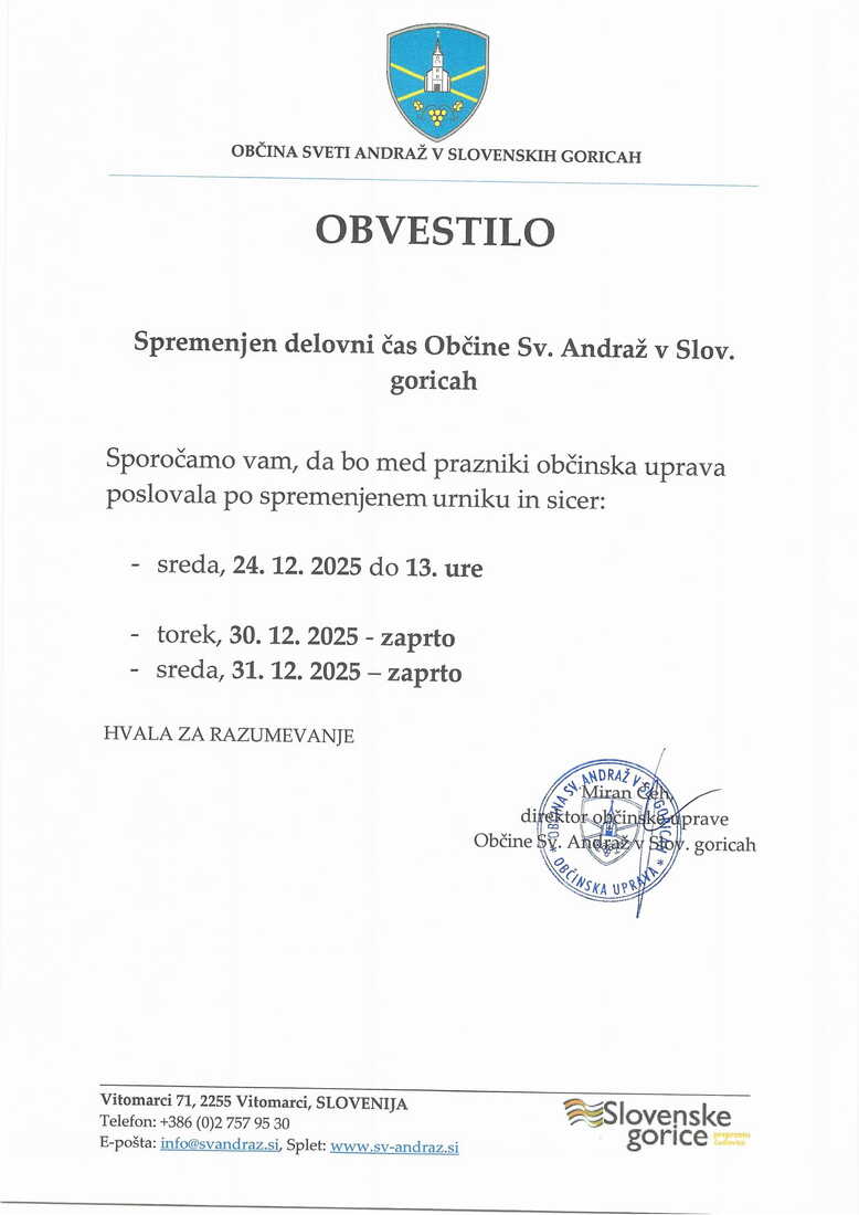 OBVESTILO spremenjen delovni čas občinske uprave med prazniki