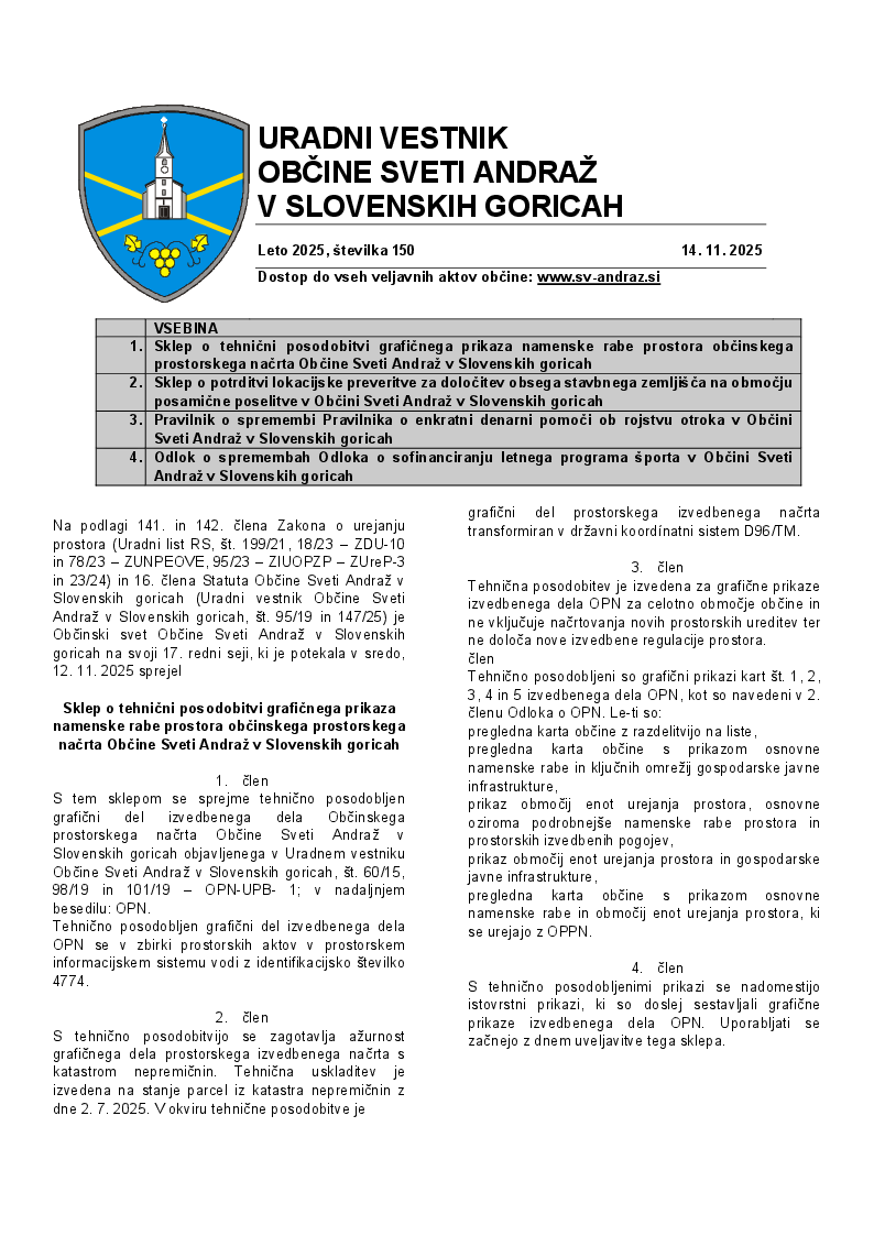 SKLEP o tehnični posodobitvi grafičnega prikaza namenske rabe prostora občinskega prostorskega načrta Občine Sveti Andraž v Slovenskih goricah (št. 150, november 2025)